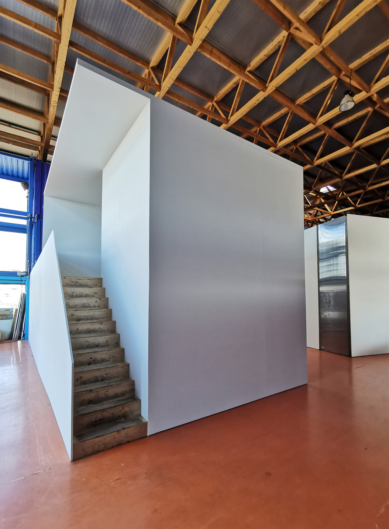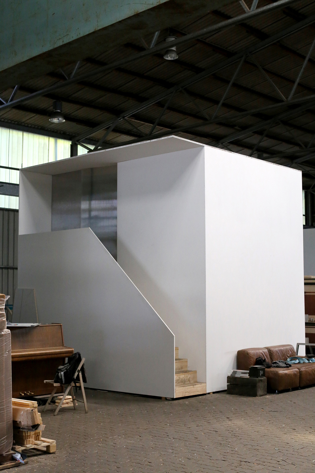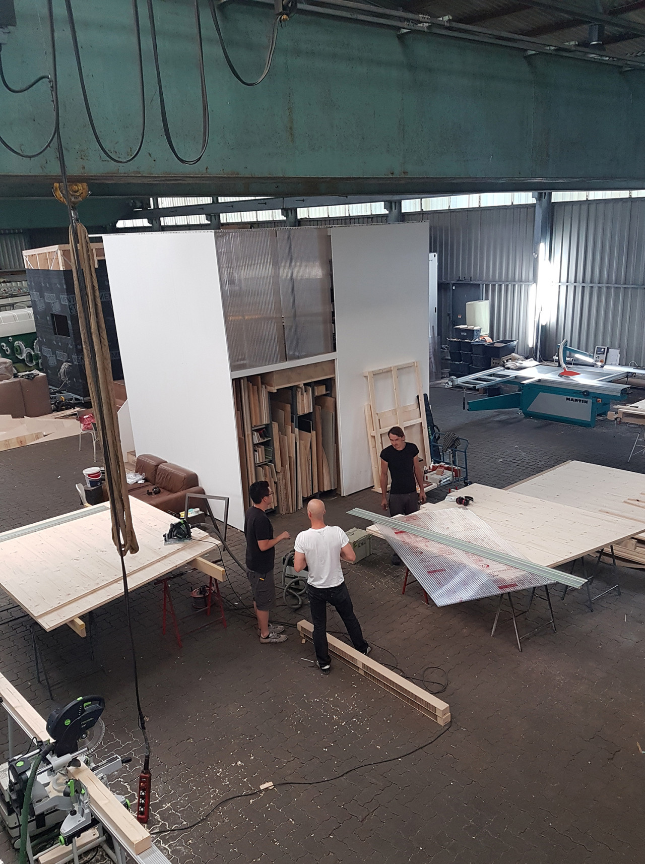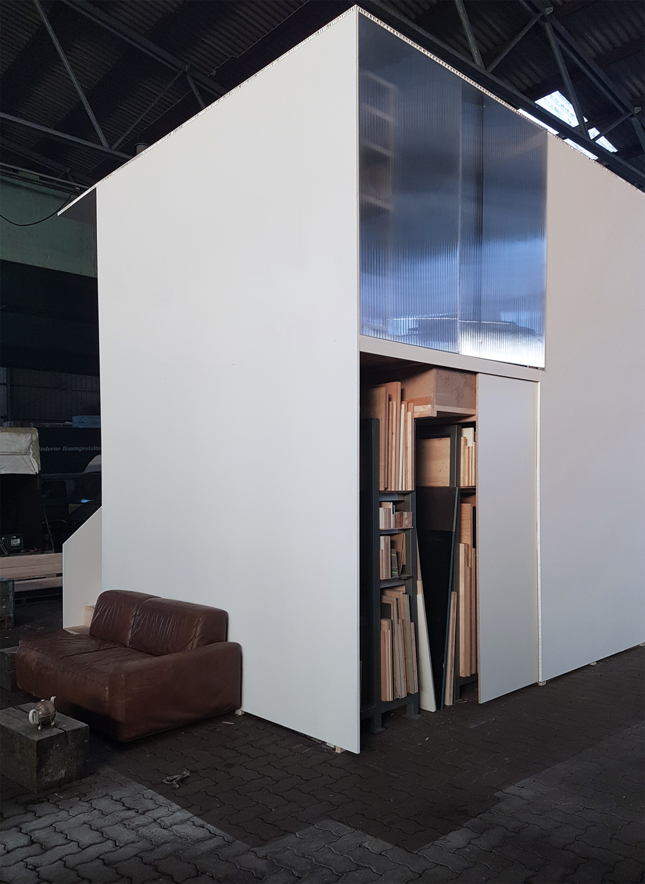 material storage and office building in our workshop at Mundhalle eG, 4m x 4m x 4m chipboard, 19mm solid spruce 40mm, wood fibre insulation 40mm, polycarbonate 16mm