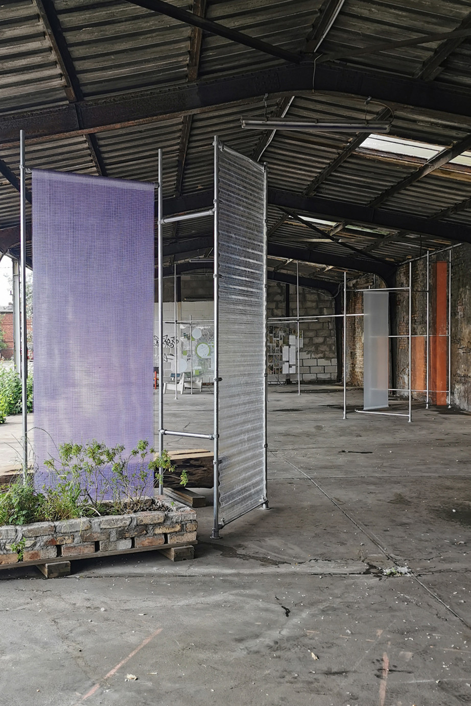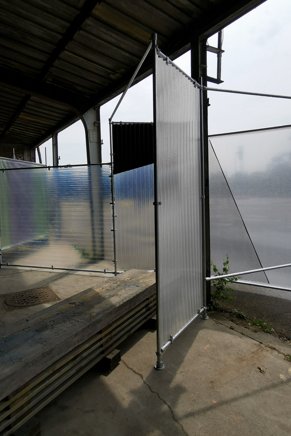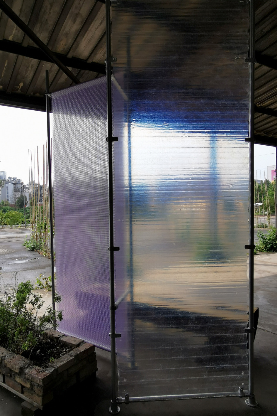 Mobile paravents for a public community managed project, made of various materials from construction sites, such as steel pipes, tarpaulins, etc.