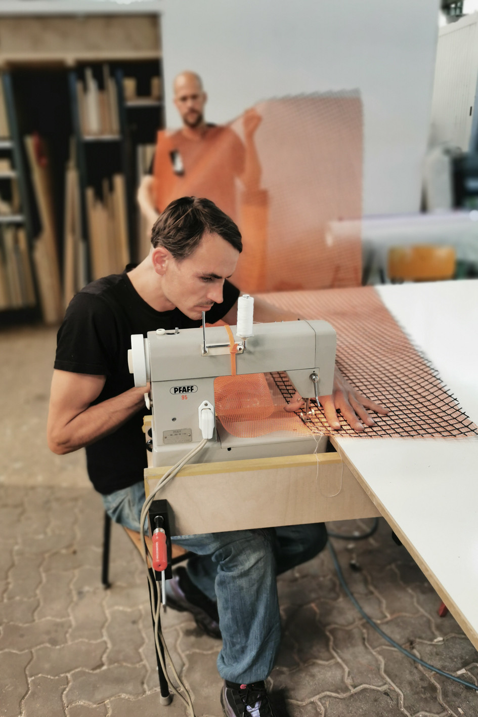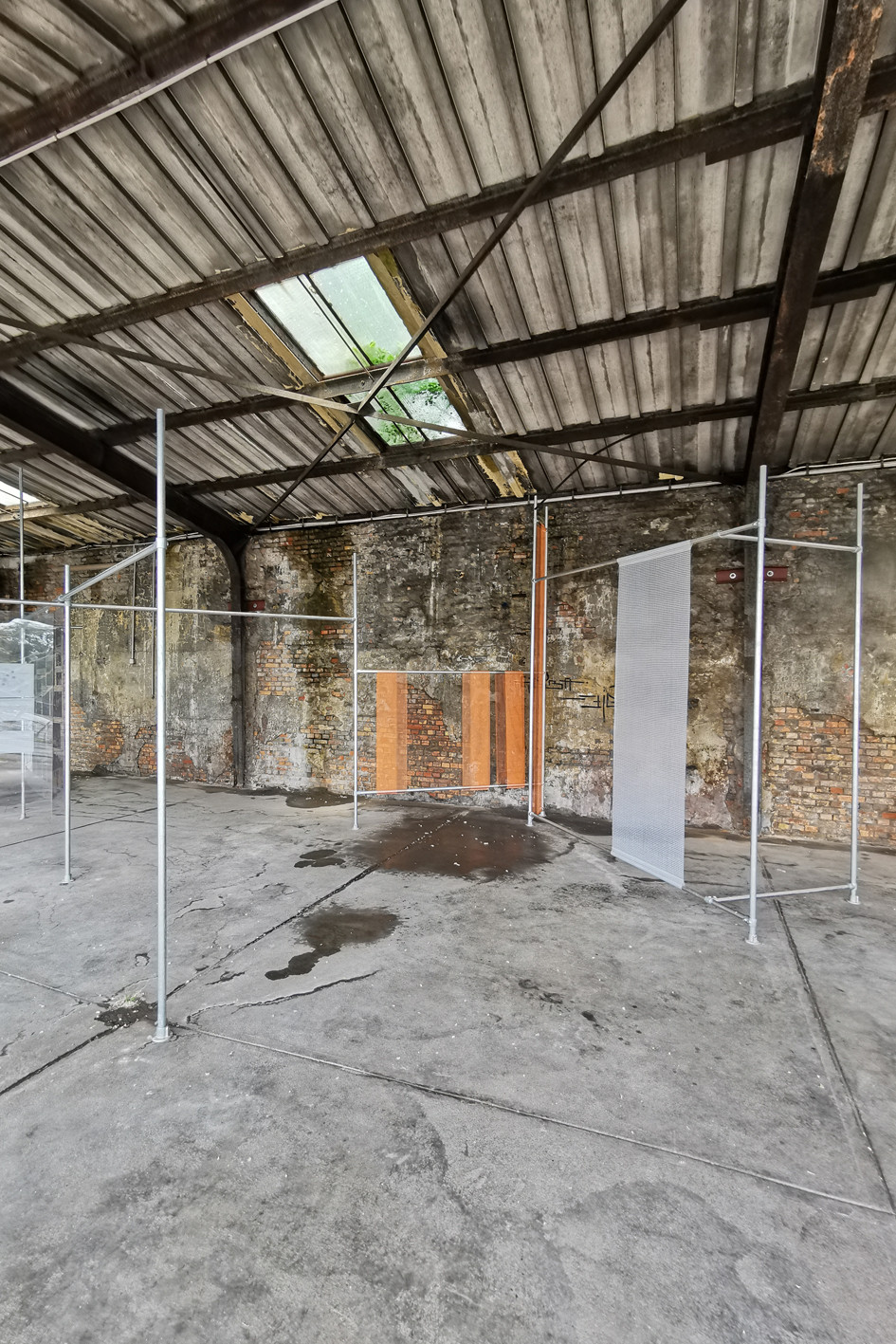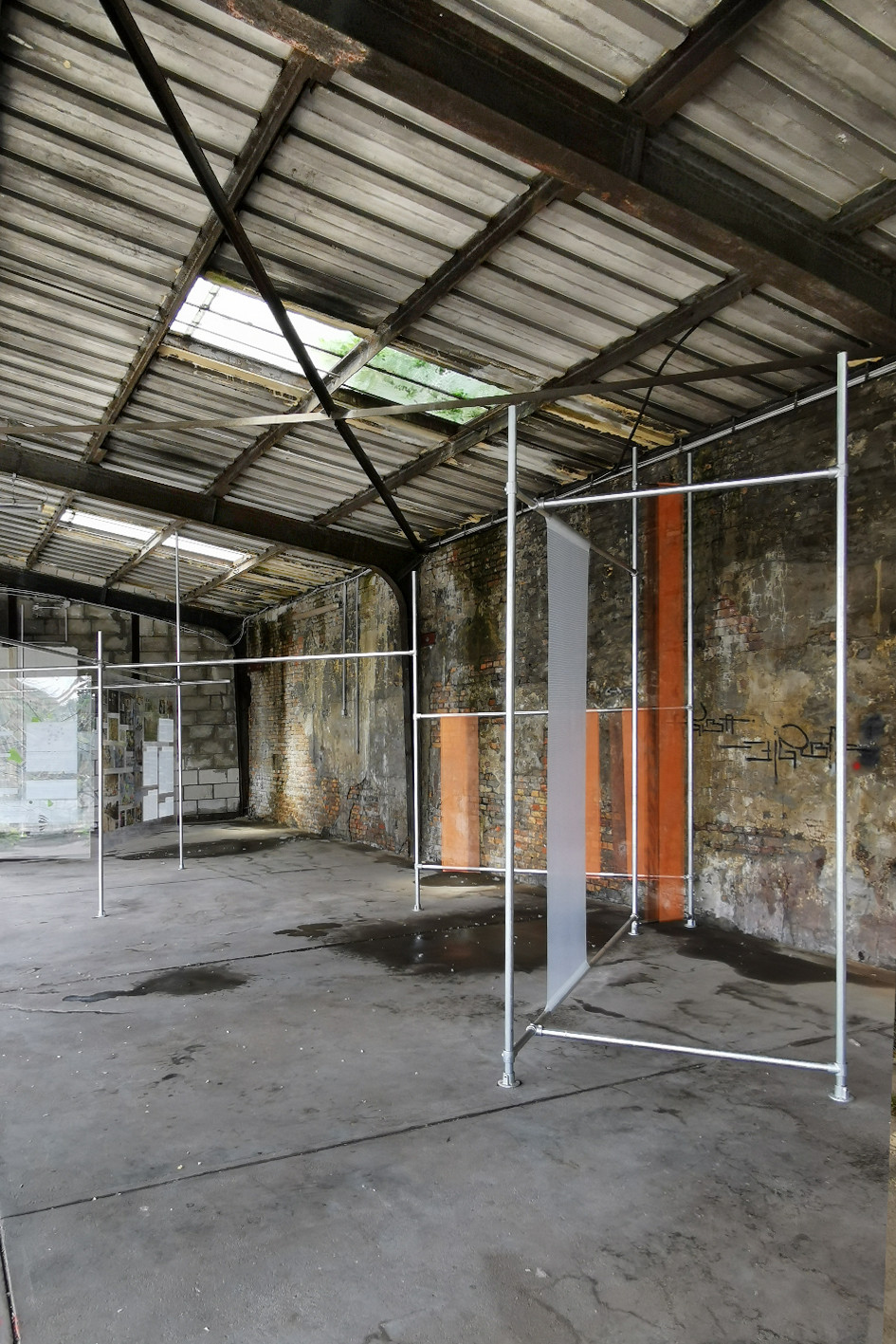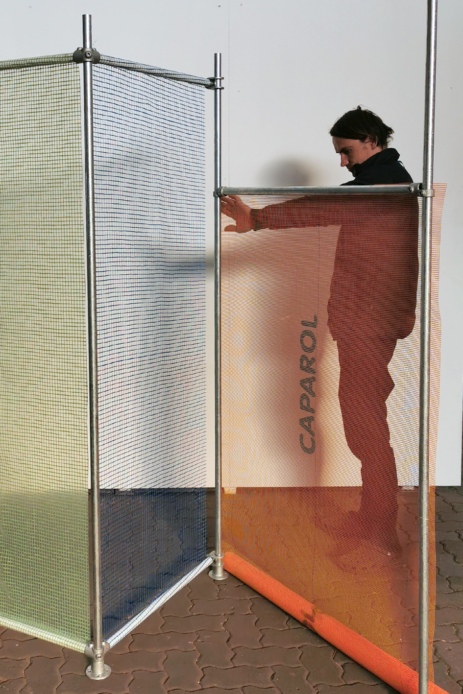 Mobile paravents for a public community managed project, made of various materials from construction sites, such as steel pipes, tarpaulins, etc.